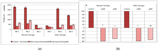 Average population density of the trophic group Actinomycetes (CFU g−1 absolutely dry soil) in the rhizosphere communities formed after introduction of AM fungi: (mAM) mono-mycorrhizal and (pAM) poly-mycorrhizal inoculants. (a) Average values for the particular varieties of garden pea with “normal” leaf type (Nlt-1—cvr. Marsi, Nlt-2—cvr. Plovdiv and Nlt-3—cvr. 22/16-n) and “afila” leaf type (Aflt-1—cvr. 22/16-af, Aflt-2—cvr. Kazino and Aflt-3—cvr. Echo). Error bars indicate standard error of the mean (SE). (b) Relative values of the differences in the population levels of the trophic group Actinomycetes (%) compared to the untreated controls, including means for both “normal” leaf type and “afila” leaf type genotypes. The significance of the differences between means of controls and treatments were calculated with the two-tailed Student’s t-test (at df—10; * p < 0.10), ns—nonsignificant).