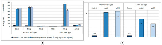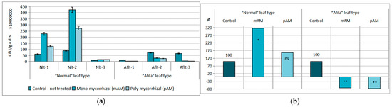 Average population density of the trophic group Phosphate-solubilizing bacteria (PSB) (CFU g−1 absolutely dry soil) in the rhizosphere communities formed after introduction of AM fungi: (mAM) mono-mycorrhizal and (pAM) poly-mycorrhizal inoculants. (a) Average values for the particular varieties of garden pea with “normal” leaf type (Nlt-1—cvr. Marsi, Nlt-2—cvr. Plovdiv and Nlt-3—cvr. 22/16-n) and “afila” leaf type (Aflt-1—cvr. Marsi, Aflt-2—cvr. Plovdiv and Aflt-3—cvr. 22/16-af). Error bars indicate standard error of the mean (SE). (b) Relative values of the differences in the population levels of the trophic group Phosphate-solubilizing bacteria (PSB) (%) compared to the untreated controls, including means for both “normal” leaf type and “afila” leaf type genotypes. The significance of the differences between means of controls and treatments were calculated with the two-tailed Student’s t-test (at df—10; *** p < 0.01, ns—nonsignificant).