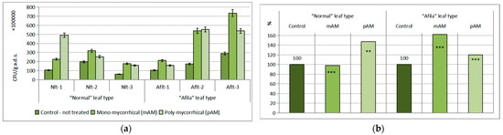 Average population density of the free-living diazotrophic bacteria Azotobacter (CFU g−1 absolutely dry soil) in the rhizosphere communities formed after introduction of AM fungi: (mAM) mono-mycorrhizal and (pAM) poly-mycorrhizal inoculants. (a) Average values for the particular varieties of garden pea with “normal” leaf type (Nlt-1—cvr. Marsi, Nlt-2—cvr. Plovdiv and Nlt-3—22/16-n) and “afila” leaf type (Aflt-1—cvr. 22/16-af, Aflt-2—cvr. Kazino and Aflt-3—cvr. Echo). Error bars indicate standard error of the mean (SE). (b) Relative values of the differences in the population levels of the free-living diazotrophic bacteria Azotobacter (%) compared to the untreated controls, including means for both “normal” leaf type and “afila” leaf type genotypes. The significance of the differences between means of controls and treatments were calculated with the two-tailed Student’s t-test (at df—10; *** p < 0.01 and ** p < 0.05).