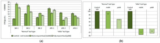 Average population density of the symbiotic nitrogen-fixing bacteria Rhizobium (CFU g−1 absolutely dry soil) in the rhizosphere communities formed after introduction of AM fungi: (mAM) mono-mycorrhizal and (pAM) poly-mycorrhizal inoculants. (a) Average values for the particular varieties of garden pea with “normal” leaf type (Nlt-1—cvr. Marsi, Nlt-2—cvr. Plovdiv and Nlt-3—cvr. 22/16-n) and “afila” leaf type (Aflt-1—cvr. 22/16-af, Aflt-2—cvr. Kazino and Aflt-3—cvr. Echo). Error bars indicate standard error of the mean (SE). (b) Relative values of the differences in the population levels of the symbiotic nitrogen-fixing bacteria Rhizobium (%) compared to the untreated controls, including means for both “normal” leaf type and “afila” leaf type genotypes. The significance of the differences between means of controls and treatments were calculated with the two-tailed Student’s t-test (at df—10; ** p < 0.05 and * p < 0.10).