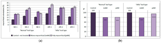 Degree of mycorrhizal colonization (%) of garden pea genotypes roots. (a) Average values for the particular varieties of garden pea with “normal” leaf type (Nlt-1—cvr. Marsi, Nlt-2—cvr. Plovdiv and Nlt-3—cvr. 22/16-n) and “afila” leaf type (Aflt-1—cvr. 22/16-af, Aflt-2—cvr. Kazino and Aflt-3—cvr. Echo). Error bars indicate standard error of the mean (SE). (b) Relative values of the differences in the percent of colonization (%) compared to the untreated controls, including means for both “normal” leaf type and “afila” leaf type genotypes. The significance of the differences between means of controls and treatments were calculated with the two-tailed Student’s t-test (at df—10; **** p < 0.001 and *** p < 0.01).