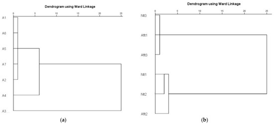 Hierarchical cluster analyses of rhizospherae microbial communities in garden peas. (a) Analysis by trophic groups of microorganisms. A1: Micromycetes; A2: Actinomycetes; A3: Ammonifying bacteria; A4: Immobilizing mineral NH4+-N bacteria; A5: Phosphate-solubilizing bacteria; A6: Azotobacter bacteria; A7: Rhizobium bacteria. (b) Analysis by pea genotypes. Cultivars of garden pea with the “normal” leaf type (Nlt-1—cvr. Marsi, Nlt-2—cvr. Plovdiv and Nlt-3—cvr. 22/16-n) and “afila” leaf type (Aflt-1—cvr. 22/16-af, Aflt-2—cvr. Kazino and Aflt-3—cvr. Echo) (Ward’s method was used).