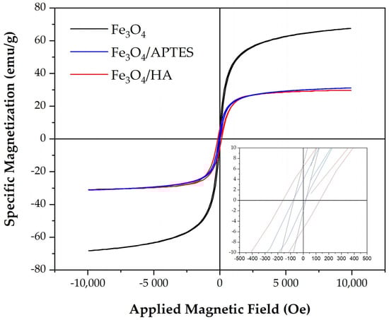 The shape of the loops indicates the ferromagnetic features of the material which are prone to their potential application. The saturation magnetizations of bare Fe3O4, Fe3O4/HA, and Fe3O4/APTES were respectively 68.2, 30.9, and 31.2 emu/g (Table 1), suggesting a 40% (w/w) of HA content in Fe3O4/HA. The attained values of saturation magnetization indicate that NMPs are stabilized by the HA or APTES functionalization exhibiting superparamagnetic properties at room temperature (Figure 1) and the corresponding variations, respectively of 54.6% for the Fe3O4/H and 54.5% for the Fe3O4/APTES, compared to bare magnetite can be explained by the noncollinearity of surface spins of MNPs and likely by the same thickness of the HA and APTES shell surrounding the nanomagnetite particles. In the absence of a magnetic field, all samples showed a similar low residual magnetism ~±4–7 emu g−1 (Table 1), due to magnetic viscosity for superparamagnetic materials [89]. The further increase of the coercivity can be related to cumulative anisotropy by phase transformation to maghemite in the case of Fe3O4/HA in terms of concentration compared to Fe3O4/APTES, which correlates with Mössbauer spectroscopy data [90].