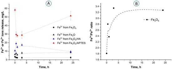 Both functionalized oxides, Fe3O4/HA and Fe3O4/APTES, release Fe3+ ions, however, the release kinetics differ significantly (Figure 2A). So, in the case of Fe3O4/HA, the Fe3+ concentration in the solution increases from 10.6 mg/L to 19.0 mg/L in a half an hour, and then decreases to 9.5 mg/L in 24 h. In the case of Fe3O4/APTES, on the contrary, a decay of Fe3+ release (from 58.2 mg/L to 29.6 mg/L in half an hour after suspension) was revealed with a subsequent increase of Fe3+ concentration almost to the initial value of 51.4 mg/L after 24 h. In general, functionalized MNPs release more Fe3+ ions compared to bare MNPs, but do not or negligibly release Fe2+ ions. For this reason, bare MNPs represent an effective source of a pair of Fe2+/Fe3+ ions, whereas the HA and APTES functionalized nanoparticles, under the specified synthesis conditions, are a source of only the Fe3+ ions.