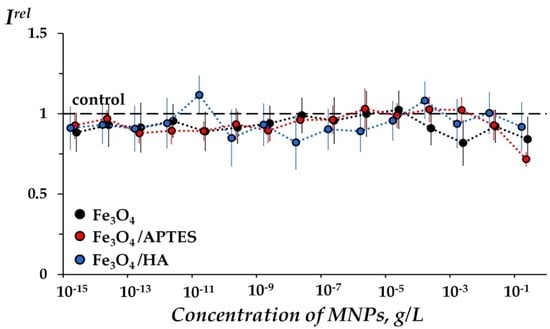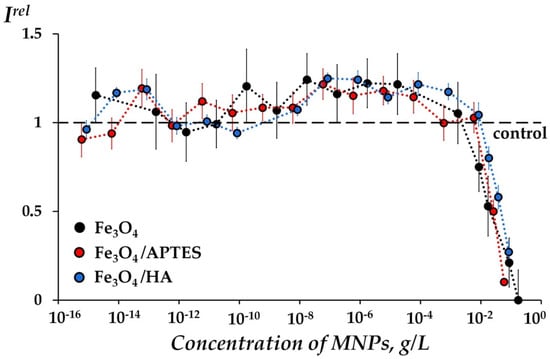 Relative bioluminescence intensity, Irel, in bacterial suspension vs. MNP concentration, g/L. Bare Fe3O4–black circles, Fe3O4/APTES–red circles, and Fe3O4/HA–blue circles.