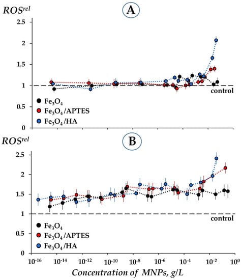 Relative ROS content, ROSrel, at various concentrations of MNPs in suspensions of two types: (A) bacteria-free solutions, (B) bacterial suspensions. Contents of ROS in the control samples were ~3 × 10−6 M in both bacteria-free (A) and bacterial (B) media. Bare Fe3O4–black circles, Fe3O4 /APTES–red circles, and Fe3O4/HA–blue circles.