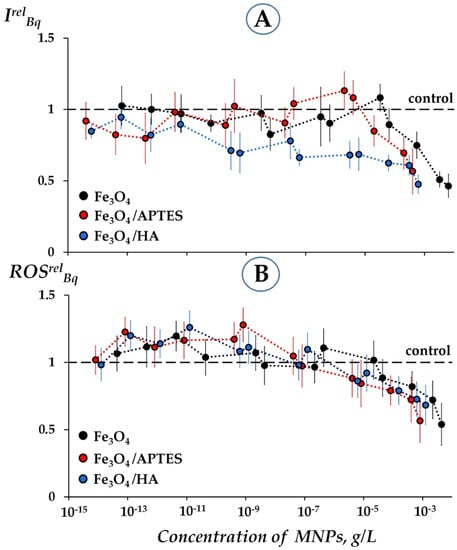 Figure 5A shows the Irel Bq-values at different concentrations of MNPs. All considered MNPs did not activate reliably the bacterial bioluminescence under oxidative stress, hence, it can be reasonably concluded that MNPs do not induce any antioxidant activity. Oppositely, the Irel Bq-values showed a suppression of the bioluminescence intensity (i.e., Irel Bq < 1, p < 0.05) at higher concentrations of MNPs (>5 × 10−5 g/L), confirming the prooxidant properties of MNPs. The HA-modified MNPs (Fe3O4/HA) suppressed bioluminescence intensity (i.e., Irel Bq < 1, p < 0.05) reliably in a wider range of concentrations (10–12–10–2 g/L), as compared to Fe3O4 and Fe3O4/APTES and this can be explained by the partial hydrolysis of the HA coating in Bq solutions which leads, as a result, to an oxidized iron higher content (Fe3+, surface and/or free) in Fe3O4/HA suspensions.