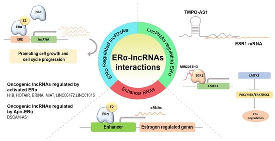 In this review, we described the functional relationship between ERα and lncRNAs, highlighting their contribution to the regulation of crucial BC cell signaling activities. Interestingly, in this context, the binding of ERα by estrogens or the absence of hormone stimulation showed different contributions to BC progression and cancer cell survival, suggesting a new landscape that might be studied and exploited for novel potential therapeutic target identification.