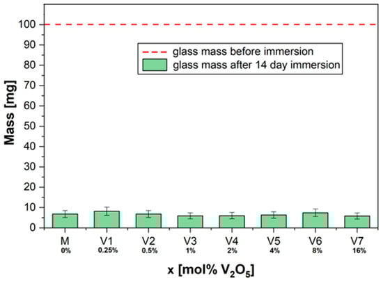 In our case, the solubility of the glasses with xV2O5∙(100 − x)[CaF2∙3P2O5∙CaO], where x = 0.25, 0.5, 1, 2, 4, 8, and 16 mol%, was increased for all compositions (Figure 1). The doping (V2O5) of the structure of phosphate glasses did not affect their dissolution rate. After 14 days of incubation, the glass samples showed a mass loss of over 90% of their initial mass.