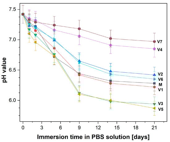 During 21 days of immersion, the evolution of pH values in a phosphate buffer solution (PBS) was measured at different time intervals; the results are illustrated in Figure 2. All investigated compositions caused a decrease in the pH of PBS. A significantly strong decrease was visible on the first day. Then, a slower decrease over the rest of the incubation time was noticed. According to the procedure, several measurements of pH were performed, with the most important control points being: on day 0, an initial pH value of 7.43; on day 9 pH values ranging from 7.18 to 6.10; and on day 21, pH values ranging from 6.97 to 5.94.