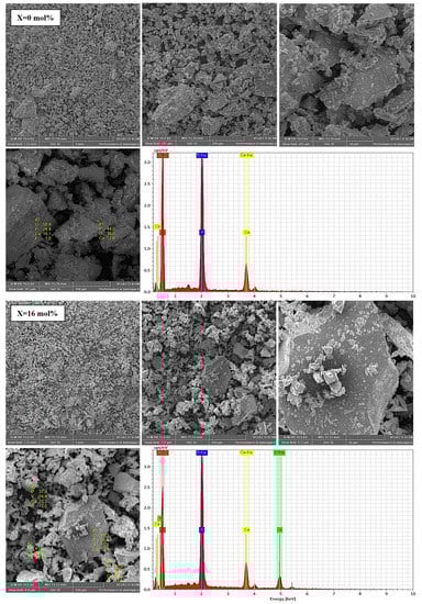 SEM micrographs and EDS analysis for glass samples with x = 0 and 16 mol% V2O5 used in the dissolution experiments. Colour legend: O (red), Ca (yellow), V (green) and P (blue).