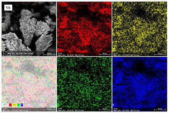 To confirm the homogeneous structure of the studied glasses, SEM characterizations combined with EDS were performed. EDS mapping analysis was performed for the entire glass system. A representative image of V6 glass is shown in Figure 4; the red, blue, yellow, and green dots correspond to O, P, Ca, and V distribution states, respectively.
