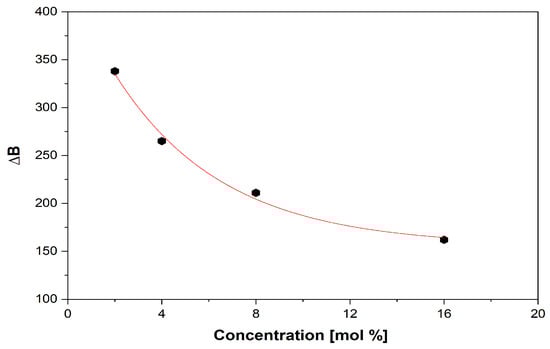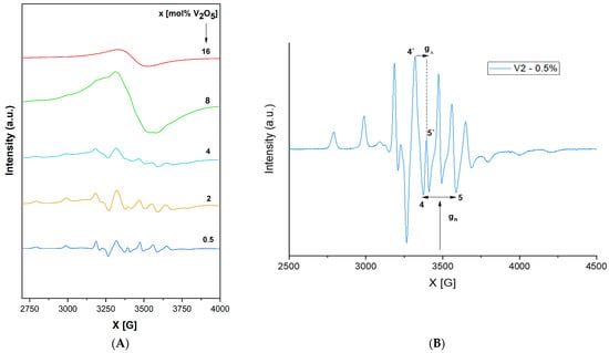 The EPR spectra of a vanadium-doped xV2O5∙(100 − x) [CaF2∙3P2O5∙CaO] glass system with 0 ≤ x ≤ 16 mol% are presented in Figure 5A.
