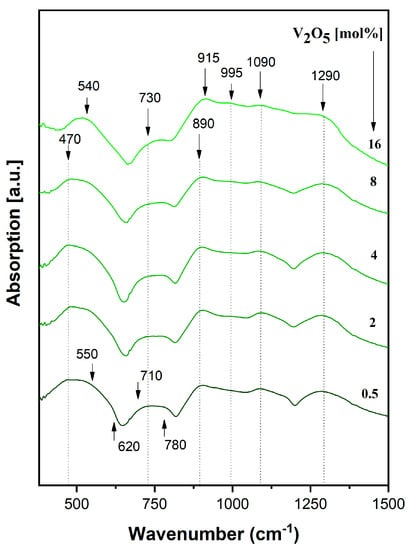 No significant changes were observed in the shape of IR spectra with up to 4 mol% vanadium content.