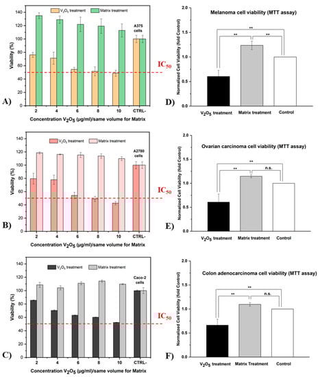 Therefore, our results suggest that the proliferation of the three tumor lines (A375, A2780, and Caco-2) was strongly affected by the applied V2O5-based treatment in a manner dependent on the concentration of V2O5 ions. Furthermore, the matrix treatment (without V2O5) provided an optimal environment for cell attachment and proliferation.