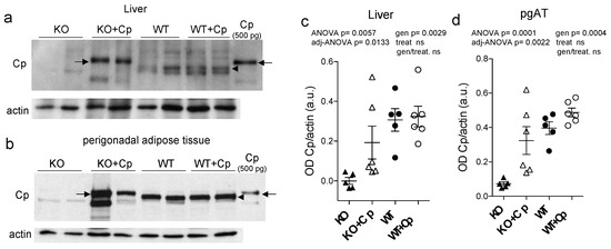 After two months of Cp treatment, we found that Cp protein accumulated in both the liver and perigonadal adipose tissue (pgAT) of CpKO mice (Figure 2a,b). In mouse tissue extracts, the administered human Cp was distinguishable from the endogenous murine Cp by its larger molecular mass (Figure 2, arrows vs. arrowheads), as previously reported [24].