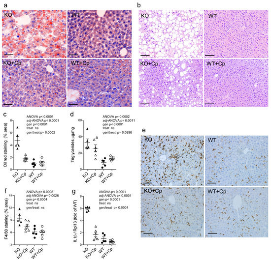 Quantitative analysis of lipids droplets showed a significant difference between CpKO and WT (genotype effect p < 0.0001). Two months of Cp treatment limited liver steatosis in CpKO, reducing accumulation of lipid droplets in hepatocytes (interaction genotype/treatment p = 0.0002) (Figure 3a,c). The specificity of the genotype/treatment interaction on CpKO mice was also supported by the lack of effect due to treatment independently by the genotype (treatment effect not significant, ns). The reduction in accumulation of cytosolic lipid droplets was also detected by the reduction of hepatocyte macrovesicles visible in the histological sections (Figure 3b). According to the presence of steatosis, the triglycerides level in the liver of CpKO mice was higher than WT (genotype effect p < 0.0001) and showed a trend toward reduction upon Cp administration (interaction genotype/treatment p = 0.0896) (Figure 3d). A significant increase of staining for the F4/80 antigen, a marker for Kupffer cells and infiltrating macrophages, was detected in CpKO mice compared to WT mice (genotype effect p = 0.0004), which in turn indicated hepatic tissue inflammation (Figure 3e,f). In CpKO liver, the stained cells appeared more interdigitated and widespread than in WT, also showing a more intense staining. The Cp replacement treatment showed a trend in preventing the macrophages infiltration, in the absence of significant genotype/treatment interaction (Figure 3e). However, from the morphological point of view, the F4/80-positive cells in CpKO treated mice were not different from WT (Figure 3f). The inflammatory condition was also indicated by the significant 6-fold increased IL1ß mRNA expression in the liver of CpKO mice compared to WT mice (genotype effect p < 0.0001). Moreover, CpKO mice treated with Cp showed a significant reduction of the IL1ß mRNA (interaction genotype/treatment p < 0.0001), indicating a direct effect of Cp in reducing the proinflammatory state (Figure 3g).