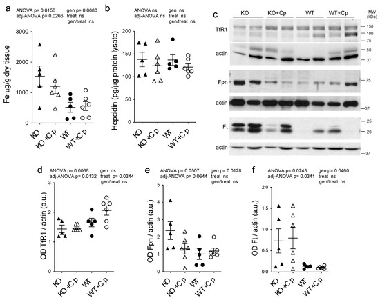 In mice liver, we also evaluated the expression levels of other proteins directly related to cellular iron homeostasis, namely ferritin (Ft), ferroportin 1 (Fpn) and transferrin receptor 1 (TfR1). Consistent with the observed iron accumulation, we found a significant reduction in expression of Fpn and increase in expression of Ft in CpKO mice compared to WT animals (genotype effect p = 0.0128 and p = 0.0460, respectively), while TfR1 expression was not different (Figure 4c–f). Treatment with Cp did not change TfR1 and Ft expression in CpKO mice, while iron exporter Fpn expression showed a reduction that was not-significant (interaction genotype/treatment not significant) (Figure 4c–f). In WT mice treated with Cp Fpn and Ft expression levels did not differ from untreated WT animals, and TfR1 level showed a trend toward increased expression suggesting a proper functioning of the iron exporter machinery (Figure 4c–f). Therefore, despite the observed reduction in liver iron accumulation, two months of Cp treatment was not able to fully restore the physiological expression profile of proteins involved in iron homeostasis in CpKO mice.