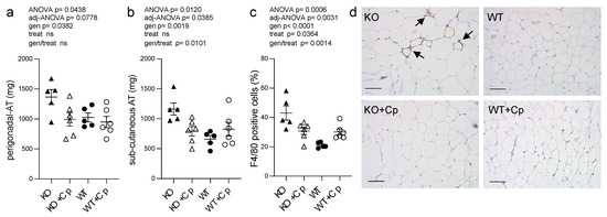 To assess whether the increase in adipose tissue mass at 10 months of age in CpKO mice was also paralleled by adipocytes hypertrophy, we measured the size of the adipocytes of pgAT. CpKO mice showed small enlargement of adipocytes size and diameter compared to WT mice, the adipocytes’ diameter showed significant genotype effect (p = 0.0338) (Supplemental Materials Figure S5) suggesting slight hypertrophy of adipocytes in Cp-deficient mice. There was also a significant infiltration of macrophages in the adipose tissue of CpKO mice compared to WT animals (genotype effect p < 0.0001), which suggested adipose tissue inflammation (Figure 5c,d; clusters of infiltrating cells are also visible in Supplemental Materials Figure S5a KO panel). Treatment with Cp was efficacious in reducing the infiltration of F4/80-positive cells (a marker of macrophages) (genotype/treatment interaction p = 0.0014). A significant effect of the treatment, independently of the genotype, was observed (p = 0.0364), even though with opposite effect on CpKO and WT animals. Indeed, while CpKO mice treated with Cp displayed a reduction of the number of infiltrating macrophages, treated WT animals showed increased infiltration of macrophages (Figure 5c).