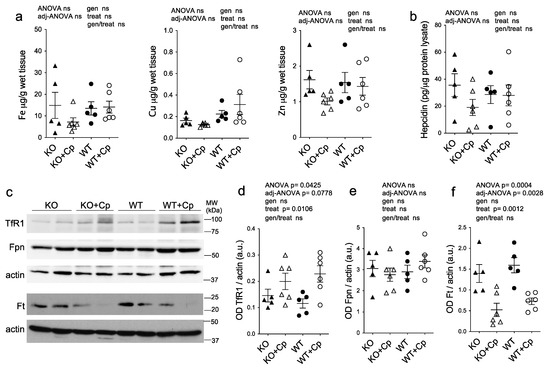 Similarly, the copper and zinc concentrations in pgAT was not different among the groups and was not influenced by Cp administration, even though Cu level seemed to be slightly higher in WT mice compared to CpKO, regardless of Cp replacement (Figure 6a). In accord with the evidence of the lack of iron deposition, in pgAT extracts of CpKO mice the expression level of hepcidin was comparable to WT mice and was not significantly affected by Cp treatment (Figure 6b). Similarly, the expression levels of the proteins related to iron homeostasis (TfR1, Fpn and Ft) in CpKO mice were comparable to the levels of the WT animals with no genotype effect (Figure 6c–f). The Cp administration induced an increase of TfR1 expression and a decrease Ft expression, in both WT and CpKO treated mice, demonstrating a conceivable effect of the treatment, while the level of Fpn was not affected (Figure 6c,d,f).