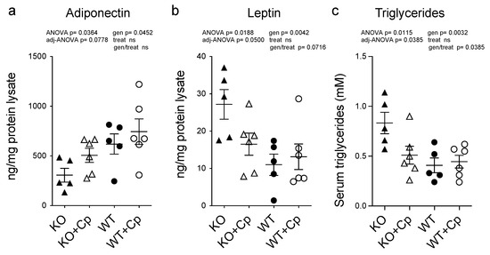 In accordance with altered adipokines profiles, the triglycerides level in the serum of the CpKO mice was also higher than in WT animals (genotype effect p = 0.0032). The administration of Cp significantly lowered the level of circulating triglycerides in the CpKO mice (genotype/treatment interaction p = 0.0385) becoming similar to that of WT mice (Figure 7c).