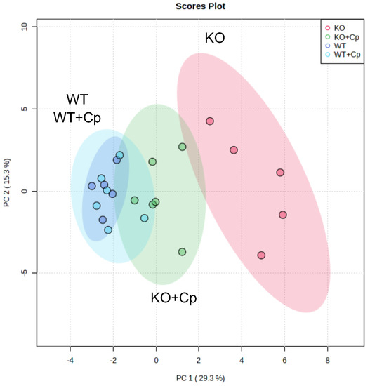 Principal component analysis was performed using 28 out of 31 parameters quantified in the study (Supplementary Materials Table S1); in particular, we excluded the body weight at 8 months of age and the level of Cp in the liver and pgAT that referred to the treatment and not to its effect. The principal component analysis clearly distinguished KO from WT mice. Indeed, a homogeneous cluster of WT mice and WT mice treated with Cp, showing a superimposed 95% confidence interval area, was evidently separated from CpKO mice (Figure 8, cyan and blue dots vs. red dots).