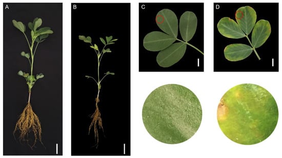 Two concentrations of normal Mn (10 µM) and Mn toxicity (300 µM) were used to study the effects of Mn toxicity stress on peanut development. Mn poisoning impeded peanut development, as evidenced by the lower peanut plant height, SPAD, fresh weight, and dry weight and the growing Mn poison spots on the leaves (Figure 1 and Table 1). Plant height dropped by 16.61% when Mn concentrations increased from 10 µM to 300 µM. (Figure 1A,B and Table 1). Furthermore, the SPAD value, which reflects the chlorophyll content, declined by 10.71%. (Table 1). Likewise, the fresh weight of shoots, fresh weight of roots, dry weight of shoots, and dry weight of roots were reduced by 63.89%, 56.69%, 54.04%, and 52.80%, respectively (Table 1). Furthermore, brown spots, which indicate Mn poisoning, were found when Mn concentrations in leaves were 300 μM, and the density of brown spots accrued with raising the concentration of Mn; evidence indicated the following a 60-times rise at the concentration of 300 μM Mn in comparison with that at 10 μM Mn (Figure 1C,D and Table 1).
