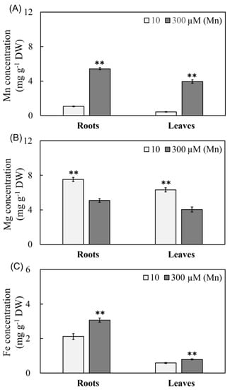 The concentrations of three metal ions (Mn, Mg, and Fe) in peanut leaves and roots were thoroughly investigated at various levels of Mn (Figure 2). The concentration of Mn rose with increased Mn availability, as evidenced by a 4.07- and 8.17-fold increase at 300 μM Mn compared with 10 μM Mn, respectively (Figure 2A). Unlike the varying in the concentration of Mn in peanut roots and plants in reaction to Mn poisoning, Mg concentration in roots and leaves declined (Figure 2B). The Mg content in roots and leaves fell by 32.40% and 36.08%, respectively, at the concentration of 300 μM Mn treatment groups in comparison with the 10 μM Mn treatment groups (Figure 2B). However, Fe concentration remarkably increased under 300 μM Mn treating, as demonstrated by 44.81% and 37.93% higher concentrations than that under 10 μM Mn treatment (Figure 2C).