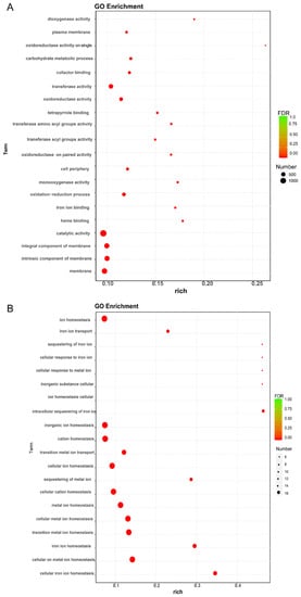 The Rich factor, the value of FDR, and the quantity of genes enriched to this GO term were used to calculate the degree of enrichment based on the GO enrichment data. The rich factor is the rate of the quantity of DEGs enriched to the quantity of DEGs annotated in the GO term, in which a higher rich factor indicates greater enrichment, and a larger FDR indicates greater significance. The enrichment in leaves was mainly observed in the plasma membrane (a total of 151 genes, containing 120 up-regulation and 31 down-regulation genes), carbohydrate metabolic process (a total of 195 genes, containing 164 up-regulation and 31 down-regulation genes), transferase activity (a total of 611 genes, containing 500 up-regulation and 111 down-regulation genes), oxidoreductase activity (a total of 348 genes, containing 273 up-regulation and 75 down-regulation genes), catalytic activity (1400 genes, including 1122 upregulated and 278 downregulated genes), integral components of membranes (a total of 782 genes, containing 611 up-regulation and 171 down-regulation genes), components of membranes (a total of 795 genes, containing 624 up-regulation and 171 down-regulation genes), and membranes (a total of 1001 genes, containing 780 up-regulation and 221 down-regulation genes) in leaves (Figure 3A and Table S7). In the roots, enrichment was mainly observed in ion homeostasis (a total of 16 genes, containing 11 up-regulation and five down-regulation genes), inorganic ion homeostasis (six downregulated genes), cation homeostasis (a total of 16 genes, containing five up-regulation and 11 down-regulation genes), cellular ion homeostasis (a total of 15 genes, containing four up-regulation and 11 down-regulation genes), cellular cation homeostasis (a total of 15 genes, containing four up-regulation and 11 down-regulation genes), metal ion homeostasis (a total of 15 genes, containing four up-regulation and 11 down-regulation genes), cellular metal ion homeostasis (a total of 15 genes, containing four up-regulation and 11 down-regulation genes), and cellular transition metal ion homeostasis (a total of 15 genes, containing four up-regulation and 11 down-regulation genes) in roots (Figure 3B and Table S8).