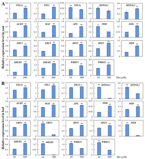 The results of transcriptome sequencing were confirmed, and qRT-PCR testing of 19 DEGs was implemented by harvested peanut leaves and roots from the experimental group (300 μM Mn) and the control group (10 μM Mn; Figure 4). The genes for testing contained seven genes that worked in transport, three genes that took effect in responses to stress, and nine genes that functioned as transcription factors (Figure 4).