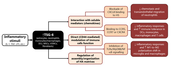 TSG-6 was the first soluble chemokine-binding protein to be identified in mammals, as it binds to a wide range of chemokines belonging to both CC and CXC subfamilies, hindering their presentation and interaction with matrix molecules [121,122]. By interacting with CXCL8, TSG-6 blocks its binding to endothelial heparan sulphate (HS), a mechanism implicated in its potent (in vitro and in vivo) inhibitory activity on neutrophil chemotaxis and transendothelial migration (Figure 1) [121,122,123,124,125]. The latter mechanism has been reported to underlie the protective effects of TSG-6 in a number of degenerative and inflammatory experimental conditions, including acute brain injury [104,105,117,126,127,128]. Moreover, binding to other chemokines that can be recognized by diverse leukocytes (e.g., CCR5, CCR7, and CXCR4) strongly suggests that TSG-6 may regulate recruitment and migration of different white blood cells (Figure 1) [121,122]. Accordingly, TSG-6 was reported to regulate the function of dendritic cells, macrophages, monocytes, and T cells attenuating their inflammatory responses and promoting immune tolerance [96,104,107,127,129,130,131,132,133].
