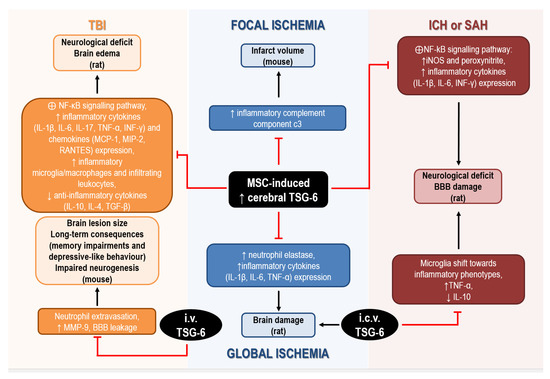 The ability of TSG-6 to attenuate neuroinflammatory reactions was also demonstrated in rats exposed to collagenase to induce intracerebral hemorrhage (ICH), intravenously transplanted with MSCs. In this model, the protective effects of MSCs on BBB and their anti-inflammatory effects were ascribed to the increased mRNA and protein expression of TSG-6 detected in the brain 24 h and 48 h after ICH [159]. In particular, although not directly demonstrated, TSG-6 elevation was suggested to underlie suppression of the activation of NF-kB signaling pathway and downstream reduction of iNOS and peroxynitrite levels [159]. More recent studies have confirmed the ability of bone MSCs to reduce neurological deficits and BBB damage caused by ICH or SAH in rat, through TSG-6 release, since these protective effects were abolished after silencing TSG-6 by siRNA [115,139]. In particular, Tang et al. (2021) speculated that TSG-6, likely secreted via exosomes by bone MSCs, acts through a paracrine mechanism to regulate activated astrocytes to preserve BBB integrity. In addition, TSG-6 was demonstrated to mediate the anti-inflammatory effects of bone MSCs, by inhibiting NF-κB signaling pathways and the cerebral increase of inflammatory cytokines (e.g., IL-1β, IL-6, INF-γ) and peroxynitrite caused by ICH or SAH in rats [115,139].