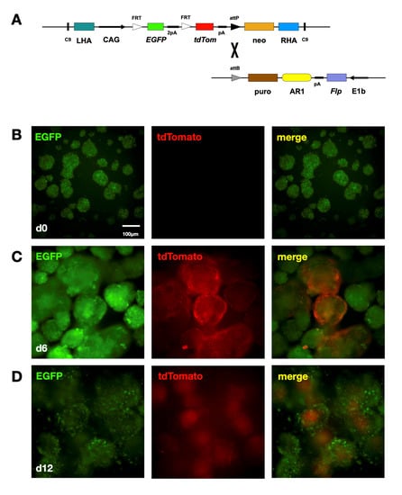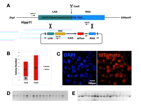 - Browning, J.; Rooney, M.; Hams, E.; Takahashi, S.; Mizuno, S.; Sugiyama, F.; Fallon, P.G.; Kelly, V.P. Highly Efficient CRISPR-Targeting of the Murine Hipp11 Intergenic Region Supports Inducible Human Transgene Expression. Mol. Biol. Rep. 2020, 47, 1491–1498. [Google Scholar] [CrossRef]