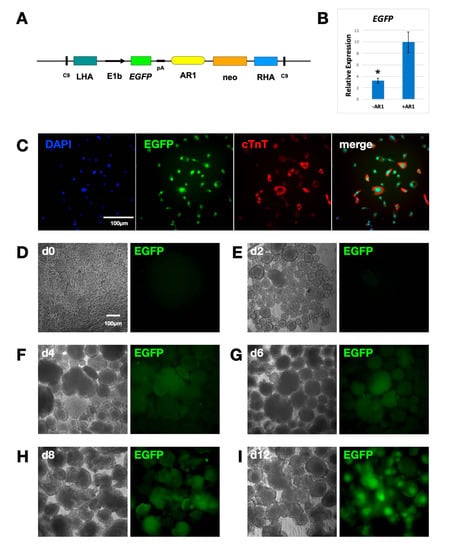 The AR1 cardiac enhancer in Hipp11 activates expression of EGFP in differentiating cells. (A) Schematic of the AR1-EGFP plasmid. It contains the neomycin resistance cassette (neo) and the EGFP gene under the control of the minimal promoter E1b and AR1 enhancer, flanked by the LHA, RHA and two CRISPR/Cas9 target sites (C9). (B) Real-time RT-PCR analysis showing relative expression of EGFP in the Hipp11 locus of differentiated cells, in the absence and presence of AR1 (n = 3, * p < 0.05). Primers are listed in the Supplementary Material (Table S3). (C) Immunofluorescence of AR1-EGFP mES cells, differentiated into cardiomyocytes. Cells expressing cardiac troponin T (cTnT) also upregulate EGFP. (D) Colonies of undifferentiated AR1-EGFP mESC showing no fluorescence. Magnification 10×. (E–I) AR1-EGFP embryoid bodies (EB), on days 2, 4, 6, 8 and 12, showing upregulation of EGFP, starting from day 4 of EB formation. On day 8, EGFP-expressing cardiac cells start migrating into the centre of the EB. Magnification 10×.
