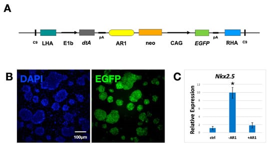 Generation of the “host” ES cell line. (A) Schematic of the “host” plasmid. It contains the diphtheria toxin gene dtA, under the control of the minimal promoter E1b and AR1 enhancer, the neomycin resistance cassette (neo) and EGFP gene under the control of the CAG promoter. The 3 cassettes are flanked by LHA, RHA and two CRISPR/Cas9 target sites (C9). (B) Stably transfected “host” colonies showing green fluorescence. (C) Real-time RT-PCR analysis showing relative expression of Nkx2.5 in differentiated “host” cells, in the absence and presence of AR1 (n = 3, * p < 0.05). In the presence of the enhancer, cardiac cells upregulate dtA and die, resulting in a marked drop in Nkx2.5 expression compared to control cells (without AR1). Ctrls are untransfected, undifferentiated mESC. Primers are listed in the Supplementary Material (Table S3).