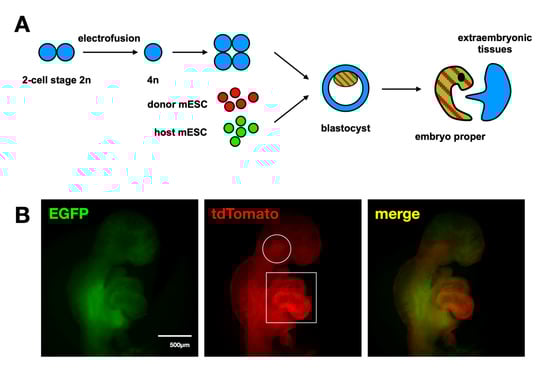 - Eakin, G.S.; Hadjantonakis, A.-K. Production of Chimeras by Aggregation of Embryonic Stem Cells with Diploid or Tetraploid Mouse Embryos. Nat. Protoc. 2006, 1, 1145–1153. [Google Scholar] [CrossRef]