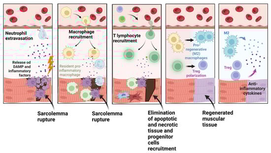 The evolution of the inflammatory response in muscle damage. When muscle tissue is damaged, the release of inflammatory factors and damage-associated molecular patterns (DAMPs) occurs, which attract various cells of the immune system. The first to intervene are the neutrophils, which extravasate to the site of injury. Here, in the case of sterile inflammation, i.e., in the absence of bacteria or other pathogens, they will start to perform a cleansing action against the apoptotic or damaged cells. In addition, they will produce reactive oxygen species (ROS), which will in turn be responsible for recruiting other types of immune cells. The inflammatory state induced by the damage also leads to the involvement of resident macrophages in the first instance, while others will be attracted by the chemotactic factors released by both the damaged muscle cells and neutrophils. Once the cleansing action of the apoptotic and necrotic cells is complete, the recall of T lymphocytes and muscle progenitors occurs. The latter, stimulated by the cascade of inflammatory signals, will be stimulated to repair the damage with the restoration of functional homeostasis. The repair process concludes with the polarization of T lymphocytes and macrophages towards immunoregulatory subsets (treg and M2 macrophages), which, through the release of cytokines and other factors, will modulate the immune response until the inflammatory status ceases. (Figure designed using Biorender.com, accessed on 7 November 2022).