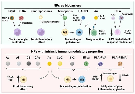 Nanoparticles-based strategies for immunomodulation in muscle diseases. Overview of different types of NPs used as biocarriers to deliver immunomodulatory agents and of NPs with the intrinsic ability to modulate the inflammatory response. (NP, nanoparticle; PLA, poly (lactic acid); PLGA, poly(lactic- co -glycolic acid); PVA, (poly(vinyl alcohol)); PEMA (poly(ethylene-alt-maleic acid)); HA-PEI, hyaluronic acid-poly ethyleneimine; AAV: Adeno-associated virus; Ag, Silver; Al, Aluminium; CB, Carbon black; CAg, Carbon-coated silver; Au, Gold; TiO2, Titanium oxide; CeO2, Cerium oxide. The mechanism of action on the different immune cell populations is also shown. (Figure designed using Biorender.com, ccessed on 7 November 2022).