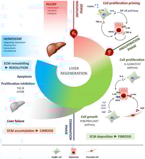 Schematic overview of liver regeneration. LR outlined in three phases: initiation, proliferation and termination. In the initiation phase different PAMPs trigger regenerative process by interacting with TLRs exposed on Kupffer cells membrane. TNF-α and IL-6 produced by Kupffer cells activates the NF-κB pathway in hepatocytes making them responsive to the proliferative signalling and forthcoming to G0/G1 transition. Once IL-6 determined the activation of proliferation, acting on JAK/STAT3 pathway, hepatocytes enter the G1 phase and growth factors signalling ensures their progression in the cell cycle. Kupffer cells and sinusoidal cells sustain hepatocytes growth by producing respectively HGF acting through c-met receptor and EGF. EGFR ligands other than EGF (FGF, VEGF, PDGF and others) act as signal modulators. Growth factors binding to their specific receptors lead to cell growth mainly through the PI3K/PDK1/AKT pathway. The termination phase takes place when the original weight of the liver is reached and results from inhibition of proliferation and growth, and apoptosis induction. The mTOR pathway controls protein translation and together with TGF-β induces hepatocyte expansion inhibition. Apoptosis cooperates with other inhibitory signals, allowing the correct attainment of liver mass. The hepatostat is responsible for the perfect integration of such processes leading liver structural and functional recovery. ECM deposition is a transitory and reversible condition of the regenerative response that arises during the proliferative phase and leads to fibrosis. ECM accumulation requires its rapid and continuous degradation and remodelling to ensure resolution, avoiding cirrhosis outcome and/or liver failure.