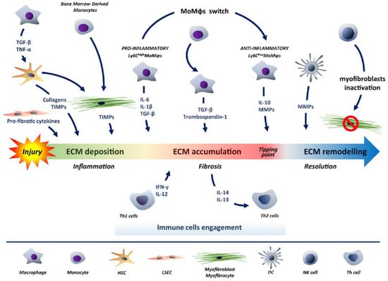 Damage-induced ECM deposition is a transitory phase of the regenerative response, and successful healing requires its subsequent clearance [151]. Thus, a Th1 type immune response is established, which avoids scarring by the production of IL-12 and IFN-γ, opposing the increased levels of TGF-β [152]. Fibrosis is the third level that occurs as a result of excessive accumulation of ECM, which leads to scarring of the liver and loss of function [153]. This phase is extremely critical and must be finely controlled because there is a risk of reaching a tipping point, where the process becomes irreversible and homeostasis of the liver will no longer be guaranteed. Ductal progenitors proliferate exponentially and at the same time the recruitment of monocytes increases, which differentiate into macrophages secreting TGF-β and thrombospondin-1 [154]. A poor balance between TIMPs and matrix metalloproteinases (MMPs) causes the over-accumulation of ECM. Specifically, metalloproteinases degrade the deposited collagen fibres, making fibrosis a reversible process. However, it can happen that activated myofibroblasts produce many TIMPs, which inhibit the action of MMPs, promoting the ECM accumulation [155,156]. Macrophages also require balancing, in particular monocyte-derived macrophages (MoMϕs). Hepatic MoMϕs are divided into two main subsets according to expression levels of Ly6C marker: Ly6Chigh and Ly6Clow monocytes [157,158,159]. Ly6C high MoMϕs represent the dominant population in the early post-damage phases, producing IL-6, IL-1β and TGF-β as pro-inflammatory action is required [160]. To achieve the resolution, after the epithelial damage has been repaired, it is essential to switch the Ly6C high monocytes to Ly6C low. The latter are characterised by an anti-inflammatory phenotype that includes the production of IL-10 and several MMPs, which allows the resolution of fibrosis and the recovery of homeostasis [161,162]. The macrophage switch is determined more by the phagocytosis of apoptotic hepatocytes by STAT3/IL-10/IL-6 signalling pathway [161,163]. In the context of fibrosis an immune response of type Th2 is involved, where inflammatory environment is enhanced by an increase of IL-4 and IL-13 and myofibroblasts deposit an excessive extracellular matrix [164,165].