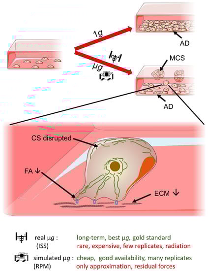 Breast cancer cells in microgravity. Schematic overview of effects, techniques and limitations. 1 g; normal gravity; µg: microgravity; AD: adherent cells; MCS: multicellular spheroids; CS: cytoskeleton; FA: focal adhesion; ECM: extracellular matrix; ISS: International Space Station; RPM: Random Positioning Machine. Some elements of this figure were taken from the smart Servier Medical Art library (https://smart.servier.com/, accessed on 19 December 2022) published under the creative commons Attribution 3.0 Unported (CC BY 3.0) license (https://creativecommons.org/licenses/by/3.0/, accessed on 19 December 2022).
