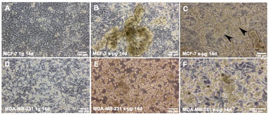 A total of 60 culture flasks containing 70% sub-confluent MCF-7 or MDA-MB-231 BCCs (n = 30 each group) were randomly assigned to the 14-day RPM experiments and to static 1 g controls. After 14 d, the 1 g control samples of both cell lines were 100% confluent and overgrown (Figure 2A,D). After 14 d, the RPM samples revealed two distinct phenotypes with different growth patterns. One part of the BCC grew adherently (AD) on the culture flask substrate comparable to the 1 g controls (Figure 1 and Figure 2B,E), while the other part grew three-dimensionally as MCSs (Figure 1 and Figure 2B,E). Interestingly, the MCF-7 cells exhibited glandular-like structures with a cellular morphology resembling epithelial polarity (Figure 2C). This phenomenon was also seen in earlier studies after a five-day RPM exposure of MCF-7 BCCs [6].