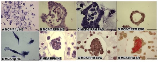 Morphology of multicellular spheroids. (A–D): MCF-7 samples; (A): hematoxylin eosin (HE) staining of l g control cells; (B): HE staining of a ring-shaped MCS; (C): periodic acid–Schiff (PAS) staining of a spheroid; (D): elastica van Gieson (EVG) staining of a small ring-shaped spheroid; (E–H): MDA-MB-231 (MDA) samples; (E): HE staining of l g control cells; (F): HE staining of a compact MCS; (G): EVG staining of spheroid; (H): sirius red (SR) staining showing collagen fibers in a spheroid. Scale bars are 30 µm.