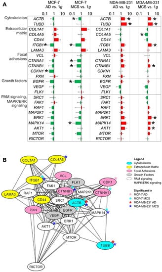 The MAPK14 (p38α; mitogen-activated protein kinase 14) gene was differentially expressed in both cell lines. MAPK14 was significantly up-regulated in MDA-MB-231 MCSs and down-regulated in MCF-7 MCSs compared with 1 g (Figure 4A). The p38α pathway plays a dual role in the organism. MAPK14 is a negatively regulating proliferation in normal cells and among others in BCCs [72]. In parallel, MAPK14 is involved in tumor-related processes such as cell metabolism, invasion, inflammation and angiogenesis [72].
