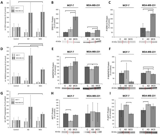 Quantitative real-time PCR and Western Blot analyses of both unphosphorylated and phosphorylated ERK1/2 (A–C), MAPK14 (D–F), and AKT1 (G–I) in MCF-7 and MDA-MB-231 cells exposed to 14 d of s-µg on the RPM. n = 5 for qPCR, n = 4 for Western Blot. C: 1 g controls; AD adherent cells on the RPM; MCS: multicellular spheroids on the RPM; brackets indicate statistically significant differences at p < 0.05.