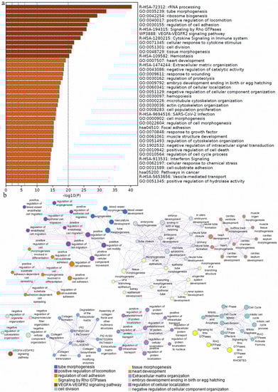 Pathway and process enrichment analysis: (a) Bar graph of top 40 enriched terms across input gene lists. The x-axis shows the significant level (−log10(p value)) by color, and the y-axis gives the enriched Gene Ontology, Reactome Pathway terms and Kyoto Encyclopedia of Genes and Genome terms; (b) the network of selected enriched gene annotation terms related to the current study is colored by cluster ID, where nodes sharing the same cluster ID are typically close to each other. The size of the circles shows the size of the gene in each term.