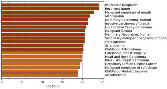 DisGeNET [35] is a platform for human disease-associated genes and variants. The enrichment analysis of the blue module was able to reveal whether the genes are associated with cancers, especially breast cancer. In Figure 8, it can be seen that the gene list is enriched for several terms related to cancer as well as breast function.