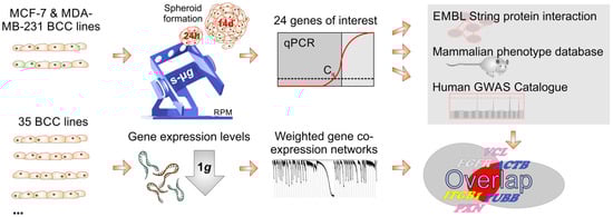 The selected and qPCR-verified genes were searched in the mammalian phenotype database and the human genome-wide association studies (GWAS) Catalog. The genes that had been up- or down-regulated in 3D spheroids in comparison with adherent cells in 1 g static controls and RPM monolayers were summarized. Data from breast tumor biopsies were downloaded from the HMS LINCS Database and differential gene expression data were evaluated by applying a weighted correlation network analysis (WGCN) [24] package for the co-expression network analysis, which is a widely used method not only for constructing gene networks, but also for detecting gene modules and identifying the central players, the so-called hub genes, within modules.