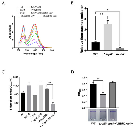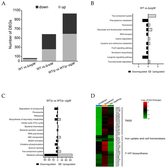 Teng, S.; Wu, T.; Gao, D.; Wu, S.; Xiao, Y.; Long, Y.; Xie, Z. Insight into the Global Negative Regulation of Iron Scavenger 7-HT Biosynthesis by the SigW/RsiW System in Pseudomonas donghuensis HYS. Int. J. Mol. Sci. 2023, 24, 1184. https://doi.org/10.3390/ijms24021184