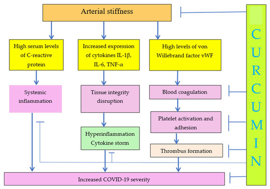 Increase of ECM stiffness results in increased COVID-19 severity. Curcumin decreases arterial stiffness and COVID-19 severity due to decrease of inflammation, cytokine storm, blood coagulation, and platelet activation.